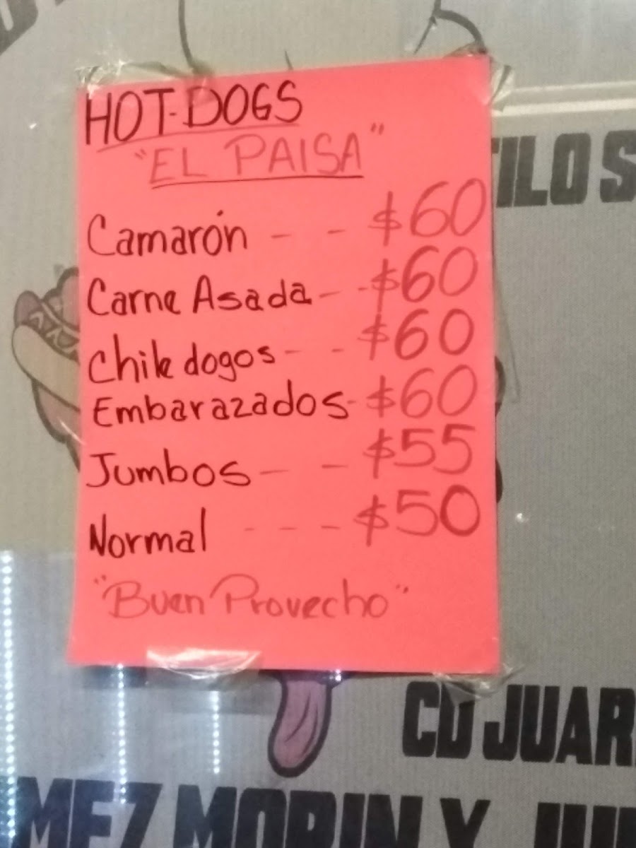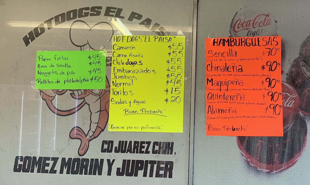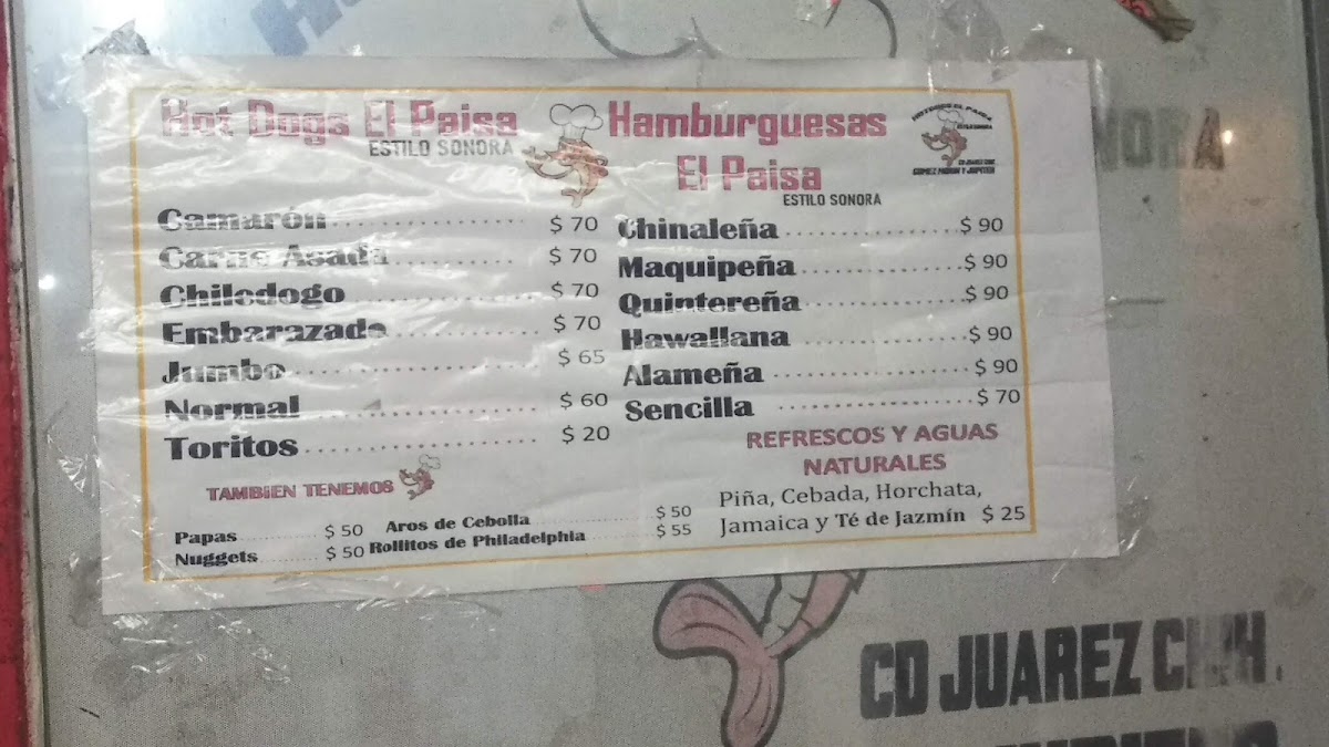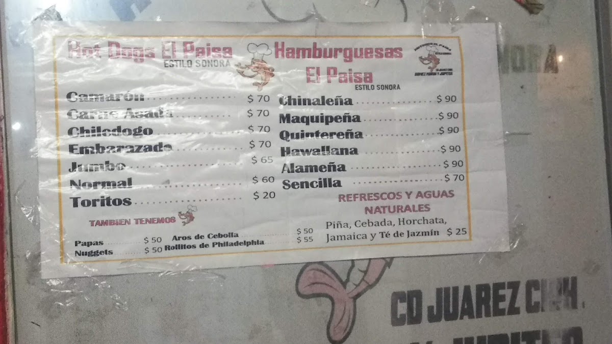Welcome to Hot-Dogs El Paisa, where traditional fast food meets bold flavors in Juárez, Chih. Nestled on Blvd. Manuel Gómez Morín, this charming eatery specializes in gourmet hot dogs that redefine your typical fare. Each creation, like the Hot Dog Embarazado, combines savory turkey sausage wrapped in crispy bacon, offering a delightful crunch with every bite. For the adventurous, the Hot Dog Camarón brings the ocean to your plate, featuring succulent shrimp paired with creamy cheese.